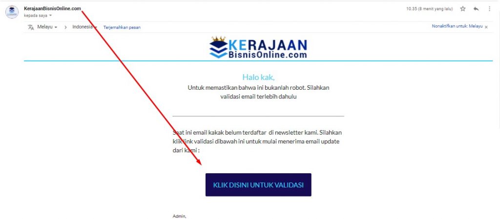 Langkah #4: Buka email dari āKerajaanBisnisOnline.comā dan Klik tombol Validasi