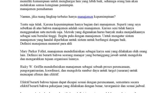 Manajemen adalah suatu konsep yang fundamental dalam dunia bisnis dan organisasi. Melalui pengertian-pengertian yang dipaparkan oleh para ahli, kita dapat memahami bahwa manajemen melibatkan berbagai tindakan dan proses untuk mencapai tujuan organisasi dengan efektif dan efisien. Pengertian manajemen tersebut juga memperlihatkan bahwa manajemen merupakan kombinasi antara seni dan ilmu, yang menggabungkan keahlian praktis dengan prinsip-prinsip teoritis. Dengan pemahaman ini, diharapkan manajemen dapat dijalankan dengan lebih baik dalam berbagai organisasi dan bidang usaha.